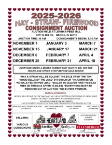 DECEMBER 20: 7 Loads of Wood $85-$500, 873 Small Hay Bales $3.50-$6.00, 61 Round Hay Bales $45-$70, 14 Big Square Bales Hay $45-$150, 349 Small Bales of Straw $2.50-$5, 8 Big Square Bales of Straw $35, 4 Round Bales of Straw $20, 14 Round Bales Corn Stalks $20-$25, 6 Round Bales Bean Stubble $30, 8 Big Squares Bean Stubble $25